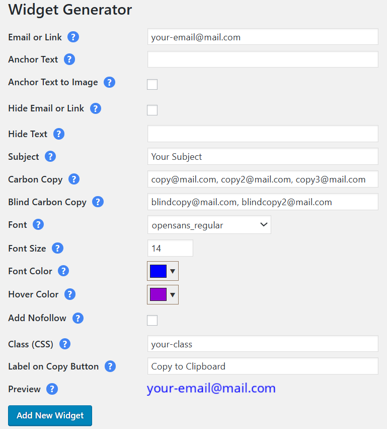 The Widget includes many useful features that help you automatically protect email addresses (as well as other contacts and any links) on your website
